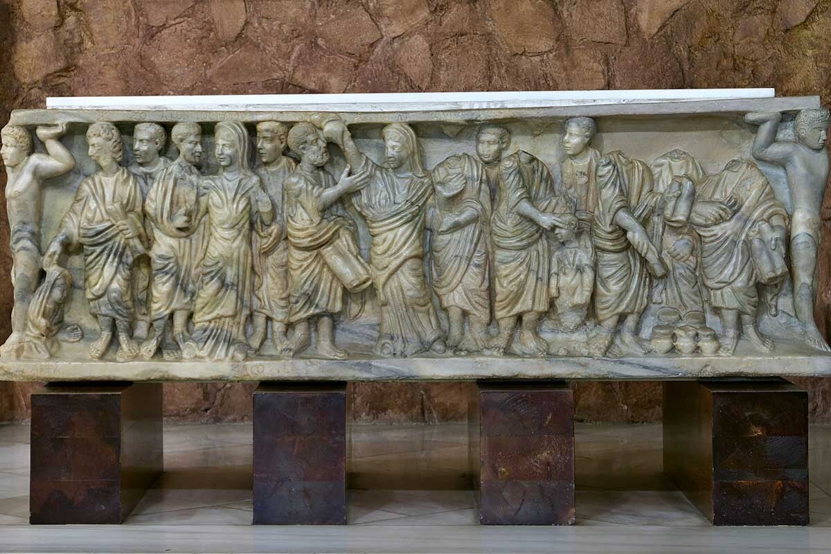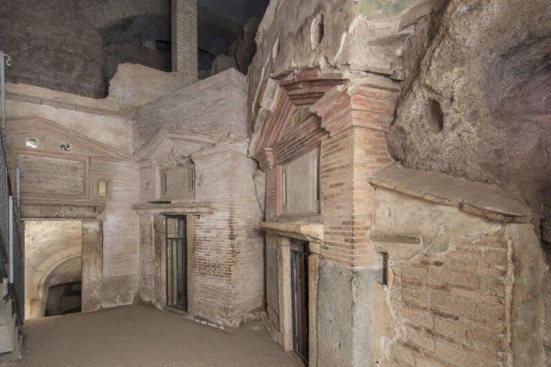 Volviendo a las catacumbas, estaban formadas por un laberinto de galerías estrechas con sepulcros individuales bajo tierra cubiertos por lastras de mármol o piedra. En las paredes laterales de los pasillos se excavaban nichos a varios niveles que albergaban sepulturas para difuntos de condición modesta.
